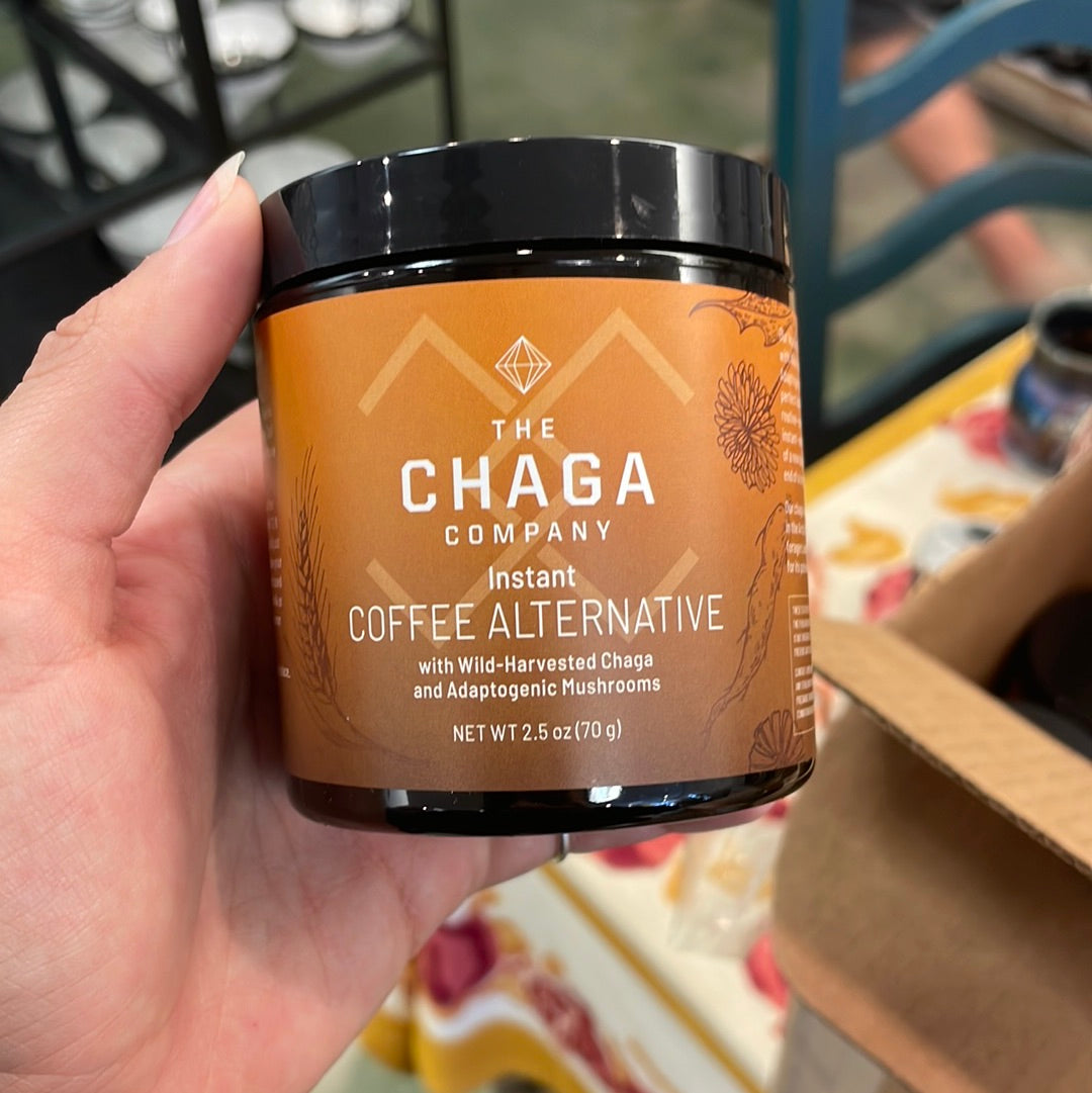 With wild-harvested Chaga and adaptogenic mushrooms. Mix a teaspoon with hot water.
