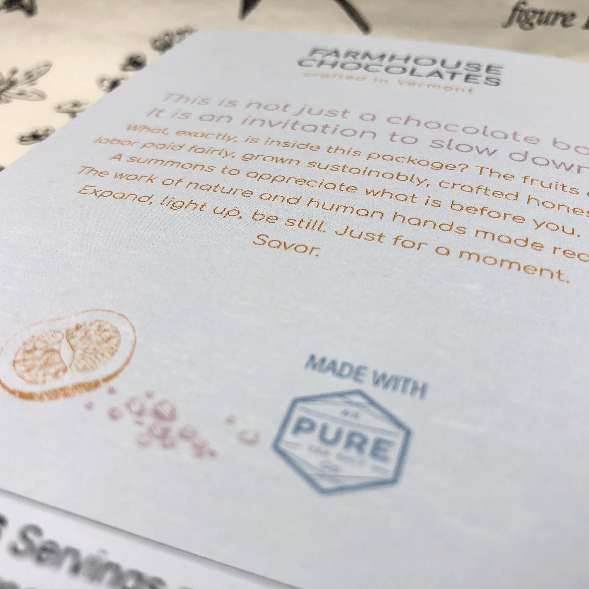 Featuring a textured, off-white kraft box (inside the bar is wrapped in gold foil, making the packaging 100% recyclable and plastic-free), w/ delicate botanical drawings, the visual shelf appeal beautifully communicates the quality & pleasure of the chocolate inside.