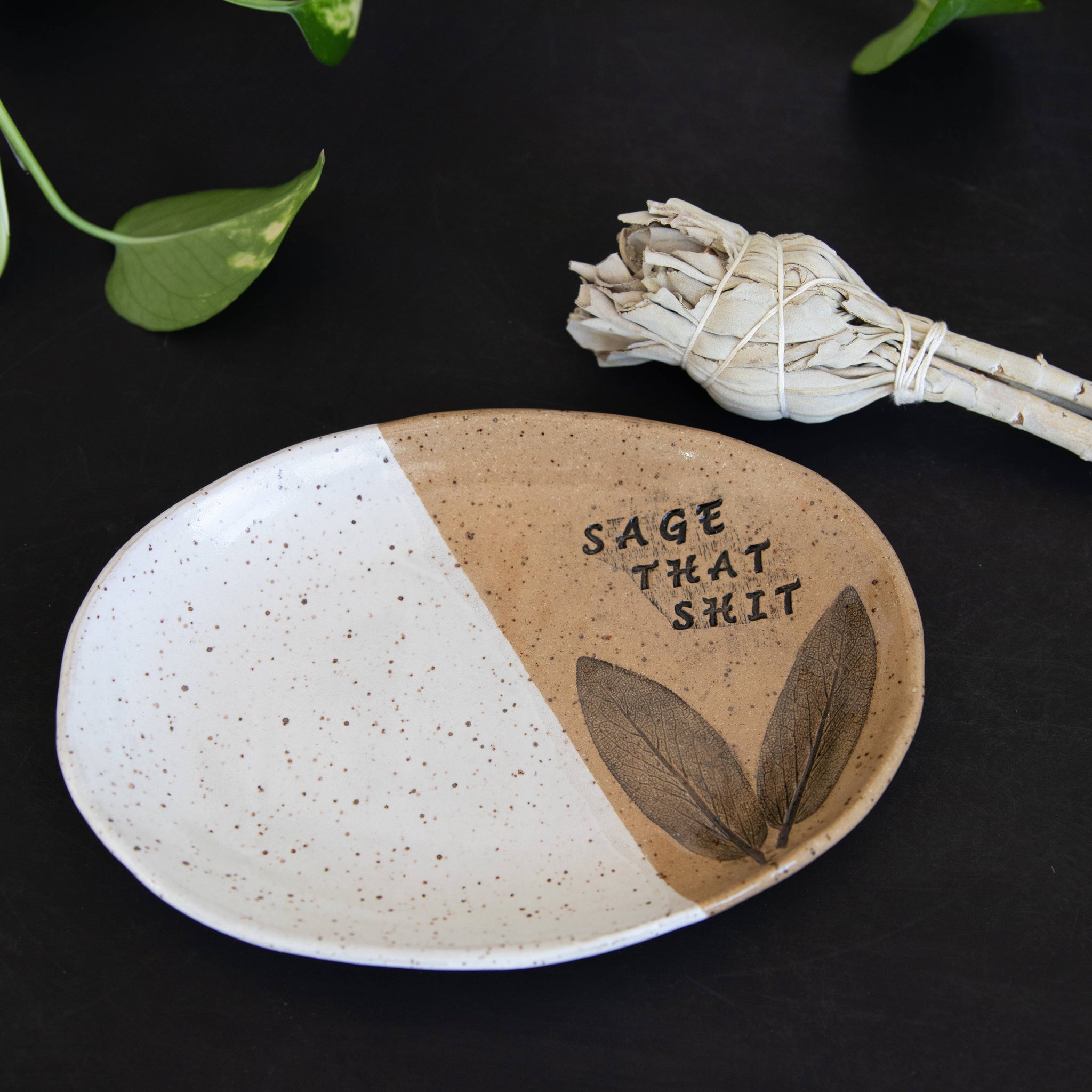 A rustic light weight stoneware dish with real sage leaves fossilized in clay, is ideal to burn sage and clean up your space.